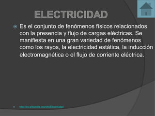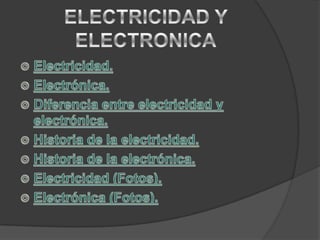 El documento trata sobre la electricidad y la electrónica. Explica que la electricidad se refiere a los fenómenos relacionados con cargas eléctricas, mientras que la electrónica estudia y utiliza sistemas basados en la conducción de electrones. También indica que la electrónica ha permitido la miniaturización de dispositivos y el desarrollo de las tecnologías de la información a través del uso de semiconductores.