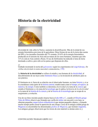 Este documento trata sobre la historia y aplicaciones de la electricidad. Explica que la electricidad ha evolucionado desde las primeras observaciones del fenómeno en la antigua Grecia hasta su estudio científico sistemático en el siglo XVIII y su uso práctico en la actualidad. También describe algunos hitos importantes como las observaciones de Tales de Mileto y los experimentos de Benjamín Franklin con rayos, así como aplicaciones actuales de la electricidad como la iluminación y maquinaria eléctrica.