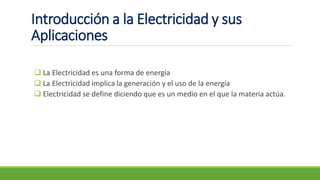 Este documento introduce los conceptos básicos de la electricidad. Explica que la electricidad implica el movimiento de electrones y cómo se genera a través de la pérdida o ganancia de electrones entre átomos. También describe los orígenes históricos del descubrimiento de la electricidad y las diferencias entre corriente continua y alterna.