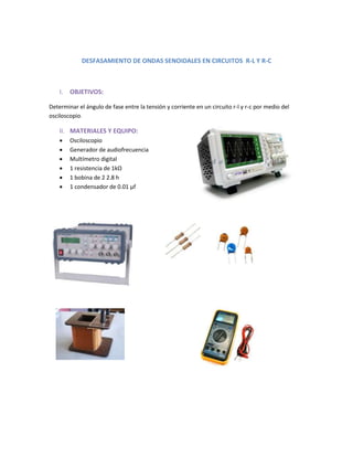 Este documento describe un experimento para determinar el ángulo de fase entre la tensión y la corriente en circuitos R-L y R-C usando un osciloscopio. En un circuito R-L, la corriente adelanta al voltaje en 90°, mientras que en un circuito R-C el voltaje adelanta a la corriente en 90°. El experimento involucra medir las tensiones y corrientes en ambos circuitos usando un generador de señales y un osciloscopio, y calcular los valores promedio de la inductancia L y la capacit