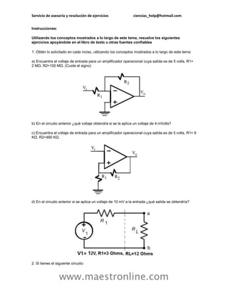 Este documento contiene varios ejercicios y problemas relacionados con circuitos electrónicos, incluyendo amplificadores operacionales, filtros, osciladores y circuitos con diodos Zener. Se solicita la resolución de los ejercicios utilizando conceptos teóricos y fuentes confiables para su explicación. También incluye la propuesta de diseño de un circuito electrónico para un aparato de ultrasonido médico.