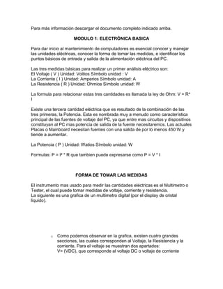 Este documento presenta información sobre conceptos básicos de electrónica como el sistema internacional de unidades, medición eléctrica, tipos de fuentes de alimentación para computadoras personales y cómo realizar mediciones básicas con un multímetro. Explica las diferencias entre voltaje, corriente y resistencia, y cómo relacionarlas a través de la ley de Ohm. También describe los componentes y conectores de las fuentes AT y ATX, incluyendo las tensiones que suministran.