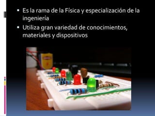 La electrónica es la rama de la física y la ingeniería que estudia y utiliza sistemas cuyo funcionamiento se basa en el flujo controlado de electrones u otras partículas cargadas. Está compuesta por una unidad de entrada, un circuito de procesamiento de información y una unidad de salida. Los circuitos electrónicos constan de componentes interconectados que procesan señales débiles amplificándolas a niveles utilizables.