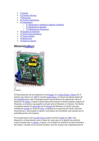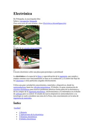 La electrónica es la rama de la física y la ingeniería que estudia y utiliza sistemas cuyo funcionamiento se basa en el flujo de electrones. Abarca desde semiconductores hasta válvulas termoiónicas, y se aplica en el diseño de circuitos electrónicos para resolver problemas prácticos. La electrónica moderna incluye tanto dispositivos analógicos como digitales, y se utiliza en campos como el control, las telecomunicaciones y la potencia eléctrica.