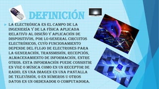 La electrónica involucra el diseño y aplicación de circuitos electrónicos cuyo funcionamiento depende del flujo de electrones para procesar información. Los elementos electrónicos clave incluyen resistencias, condensadores, bobinas e interruptores. Los circuitos integrados han revolucionado varios campos al permitir reducir el tamaño de los dispositivos electrónicos.