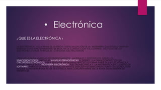 Este documento define la electrónica y describe sus principales componentes y usos. En resumen: (1) La electrónica estudia y emplea sistemas cuyo funcionamiento se basa en el flujo de electrones u otras partículas cargadas eléctricamente; (2) Utiliza una gran variedad de materiales y dispositivos, desde semiconductores hasta válvulas termoiónicas; (3) El diseño de circuitos electrónicos permite resolver problemas prácticos en campos como la ingeniería electrónica y la informática.
