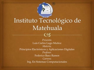 Este documento presenta el temario de la asignatura de Principios Electrónicos y Aplicaciones Digitales. El temario cubre temas de electrónica analógica como corriente alterna y directa, dispositivos pasivos y activos como resistencias, condensadores, inductores, semiconductores y sus aplicaciones. También incluye el estudio de amplificadores operacionales y sus configuraciones.
