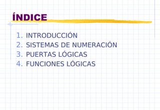 Este documento presenta una unidad didáctica sobre electrónica digital para estudiantes de 4o de ESO. Introduce conceptos como señales analógicas y digitales, sistemas de numeración como binario y hexadecimal, y puertas lógicas como inversor, OR, AND, NOR y NAND. Explica cómo implementar funciones lógicas usando tablas de verdad y puertas lógicas. También incluye ejemplos de problemas lógicos y su resolución paso a paso.