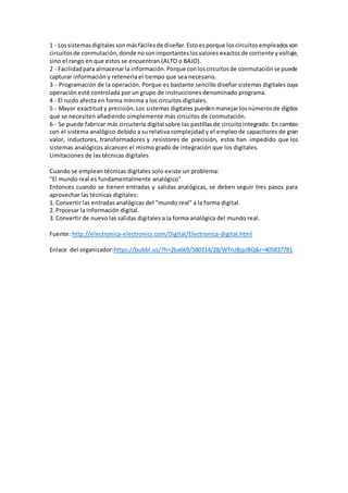 La electrónica digital se basa en valores discretos como alto y bajo, uno y cero, a diferencia de la electrónica analógica donde los valores varían de forma continua. Los sistemas digitales representan cantidades físicas de forma digital usando símbolos como dígitos, mientras que los sistemas analógicos usan representaciones proporcionales. Las técnicas digitales tienen ventajas como facilidad de diseño, almacenamiento y programación de operaciones, aunque requieren convertir señales analógicas del mundo real a la representación