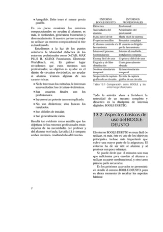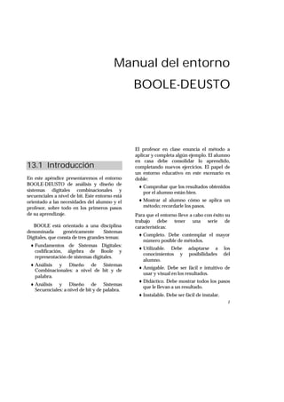 Este documento presenta el entorno BOOLE-DEUSTO para el análisis y diseño de sistemas digitales combinacionales y secuenciales a nivel de bit. Explica que BOOLE está orientado a las necesidades de estudiantes y profesores, especialmente para aprender los fundamentos. Luego compara BOOLE con entornos profesionales, señalando que BOOLE es más didáctico, fácil de usar y gratuito, mientras que los entornos profesionales son más complejos y costosos. Finalmente, presenta algunas característic