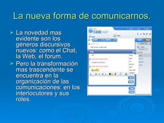 Este documento analiza los cambios en la comunicación causados por Internet y la emergencia de nuevos géneros discursivos electrónicos. Describe cómo Internet permite nuevas formas de comunidades virtuales que rompen barreras geográficas e idiomáticas. Explica que los enlaces electrónicos son fundamentales para la estructura hipertextual e intertextual en la web y crean significado. Finalmente, señala que lo electrónico ha reemplazado a lo analógico en la comunicación, pero es necesario educar a los usuarios sobre la