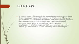 La música electrónica se genera a través de aparatos electrónicos como sintetizadores y samplers. Tiene sus raíces en los experimentos de músicos italianos en 1910, pero se popularizó a finales de los 1980s con el techno y el house. En los 1990s se consolidó como uno de los géneros más populares entre los jóvenes, impulsado por festivales masivos como Cramfields y Moonpark.