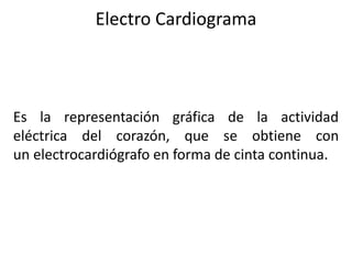 El electrocardiograma es la representación gráfica de la actividad eléctrica del corazón obtenida mediante un electrocardiógrafo. Un electrocardiógrafo es un dispositivo electrónico que capta y amplía la actividad eléctrica del corazón a través de electrodos, generando un registro continuo conocido como electrocardiograma. El electrocardiograma proporciona información sobre la frecuencia cardiaca y permite detectar posibles anomalías eléctricas en el corazón.