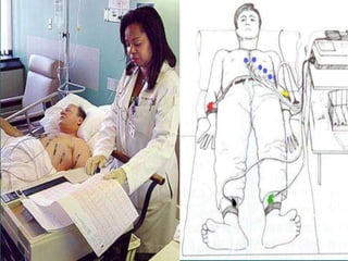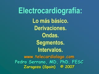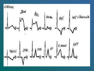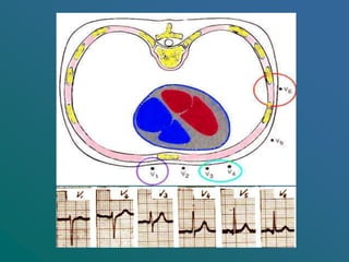 El documento proporciona información sobre las ondas, segmentos e intervalos del electrocardiograma (ECG), incluyendo su significado clínico. Explica conceptos como la onda P, el complejo QRS, el segmento ST, el intervalo PR y el intervalo QT. También describe las diferentes derivaciones del ECG y su importancia en la interpretación.