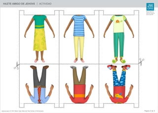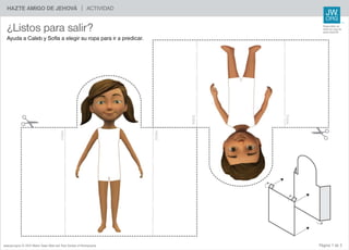 El documento presenta una actividad para niños en la que deben ayudar a Caleb y Sofía a elegir su ropa para ir a predicar. La actividad está disponible en la página web de JW.org para imprimir e incluye instrucciones para doblar las páginas.