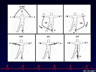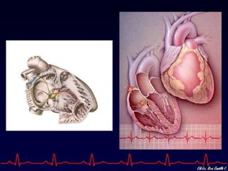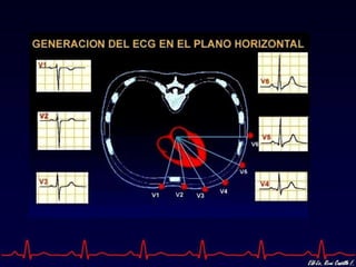 El documento describe la anatomía y función del corazón, así como el proceso de realización de un electrocardiograma (ECG). El corazón es un músculo hueco ubicado en el tórax que bombea sangre a través de dos aurículas y dos ventrículos. Un ECG mide la actividad eléctrica del corazón a través de electrodos en la piel y produce trazos que representan las contracciones cardíacas. Un ECG normal tiene 12 derivaciones que dividen la actividad eléctrica en diferentes planos para diagnosticar posibles problemas