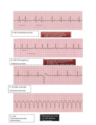 El documento describe varios ritmos cardíacos anormales incluyendo bradicardia sinusal, taquicardia sinusal, extrasístole auricular, fibrilación auricular, extrasístole ventricular, taquicardia ventricular monomórfica, fibrilación ventricular, ritmo sin pulso, asistolia y marcapasos normal.