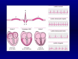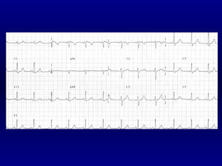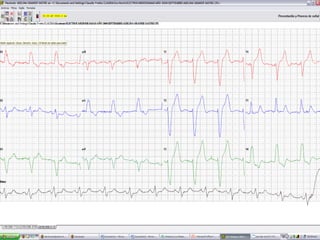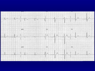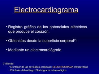 El documento proporciona una descripción detallada de las medidas de trazo pertinentes en un electrocardiograma (ECG), incluyendo definiciones de ondas, intervalos, derivaciones y el análisis de ritmo, eje y frecuencia. Explica cómo leer e interpretar un ECG, con énfasis en los valores normales para un ritmo sinusal regular, como la duración de ondas y la polaridad en diferentes derivaciones.
