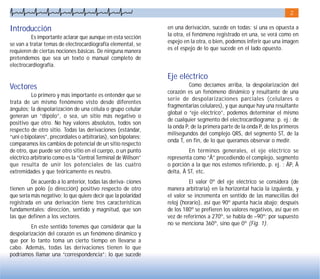 Este documento proporciona una introducción a conceptos básicos de electrocardiografía e incluye secciones sobre vectores, eje eléctrico, derivaciones estándar y precordiales, despolarización y repolarización, isquemia, lesión y necrosis, y ergometría. Explica que el electrocardiograma muestra el resultado de pequeños dipolos de despolarización celular y cómo la isquemia, lesión y necrosis afectan la forma de onda. También describe cómo las derivaciones estándar y precordiales permiten ver diferentes