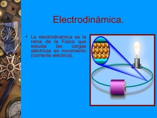 Este documento trata sobre conceptos básicos de electricidad. Explica que la electrodinámica estudia las cargas eléctricas en movimiento y que las fuentes de electricidad como baterías y generadores suministran la energía necesaria para hacer funcionar un circuito eléctrico. También define conceptos clave como corriente eléctrica, voltaje, resistencia, potencia eléctrica y efecto Joule. Finalmente, introduce los tipos básicos de circuitos eléctricos, en serie y en paralelo.