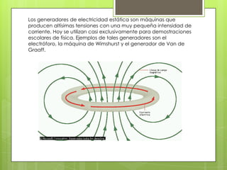 Este documento trata sobre la electricidad estática y cómo se produce. Explica que la electricidad estática es el resultado de la acumulación de cargas eléctricas en un objeto, lo que puede dar lugar a descargas eléctricas cuando dicho objeto entra en contacto con otro. También describe generadores de electricidad estática como el electróforo y la máquina de Wimshurst, y cómo la fricción entre materiales puede transferir electrones y causar una carga.
