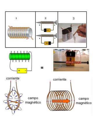 Un electroimán es un imán cuyo campo magnético se produce mediante el paso de una corriente eléctrica a través de una bobina de alambre que usualmente contiene un núcleo de hierro. Al pasar la corriente, se crea un campo magnético con polos norte y sur que permite prender y apagar el electroimán. Hans Christian Oersted descubrió en 1820 que un cable por el que pasa corriente eléctrica crea un campo magnético circundante, revelando la relación entre electricidad y magnetismo.
