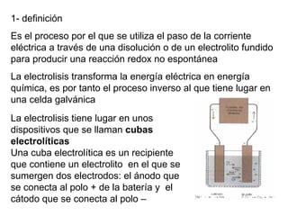 La electrolisis es el proceso por el cual se utiliza la corriente eléctrica para producir una reacción redox no espontánea en un electrolito. Ocurre en cubas electrolíticas que contienen un electrolito y dos electrodos conectados a una fuente de voltaje. En los electrodos tienen lugar semirreacciones redox, con oxidación en el ánodo y reducción en el cátodo. La electrolisis transforma energía eléctrica en química y se usa industrialmente para obtener metales puros.