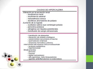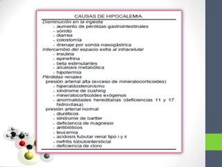Los electrolitos son sustancias que contienen iones libres que conducen la corriente eléctrica y mantienen el equilibrio de los fluidos en las células. Los principales electrolitos son el sodio, potasio, calcio y cloro, los cuales regulan funciones como la transmisión de impulsos nerviosos, contracción muscular y equilibrio ácido-base. Cada electrolito tiene niveles normales específicos que deben mantenerse para el correcto funcionamiento del organismo.