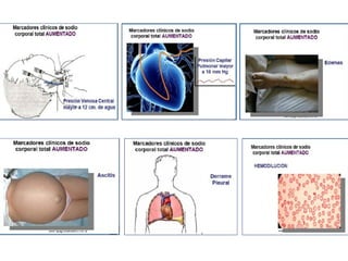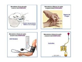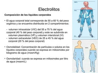 El documento habla sobre los electrolitos y su composición en los líquidos corporales. Explica que los electrolitos principales son el sodio, potasio, calcio y cloro. Estos se encuentran en diferentes concentraciones dentro y fuera de las células y juegan un papel importante en funciones como la homeostasis de líquidos y el equilibrio ácido-básico. También describe las causas y tipos de alteraciones en los niveles de estos electrolitos como la hipo e hipernatremia, hipo e hiperpotasemia, hipo e hiper