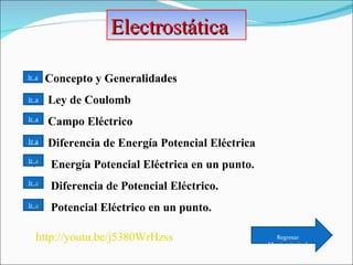 El documento proporciona una introducción al electromagnetismo, incluyendo conceptos clave como la electrostática, electromagnetismo, magnetismo, ley de Coulomb, campo eléctrico, diferencia de potencial eléctrico, energía eléctrica, resistencia, circuitos eléctricos e inducción electromagnética. Explica las propiedades de las cargas eléctricas, corriente eléctrica y clasifica los materiales según su capacidad para conducir la electricidad.
