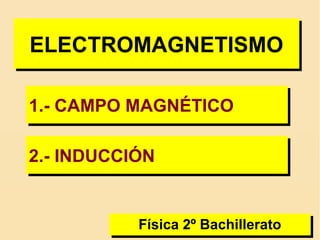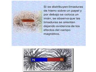 Este documento trata sobre el electromagnetismo y el campo magnético. Explica que los imanes tienen polos y que las líneas de campo magnético van del polo norte al sur. También describe cómo una corriente eléctrica genera un campo magnético y cómo este campo ejerce fuerzas sobre otras cargas eléctricas y corrientes eléctricas de acuerdo con la ley de Lorentz. Finalmente, resume cómo medir el campo magnético y algunas aplicaciones como el galvanómetro.