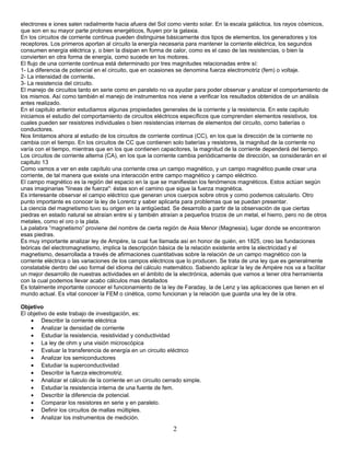 Este documento presenta un trabajo de investigación sobre teoría electromagnética. El objetivo es describir y analizar conceptos como corriente eléctrica, resistencia, circuitos eléctricos, campo magnético, leyes de Ampére, Faraday y Lenz. También cubre temas como fuerza electromotriz, instrumentos de medición, inducción electromagnética y aplicaciones de las leyes del electromagnetismo.