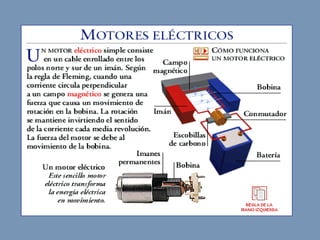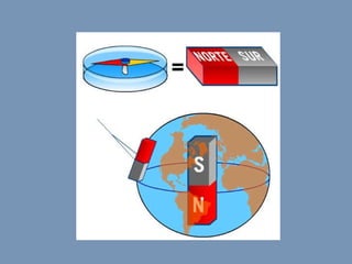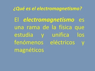 El documento explica qué es el electromagnetismo y los campos magnéticos. El electromagnetismo estudia los fenómenos eléctricos y magnéticos. Los imanes y las cargas eléctricas en movimiento generan campos magnéticos. Los imanes tienen polos norte y sur y pierden sus propiedades cuando se calientan. Los electroimanes generan un campo magnético cuando pasa corriente eléctrica por una bobina de cobre que rodea un núcleo de hierro.