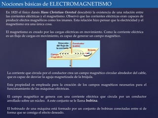 El documento explica las nociones básicas de electromagnetismo y magnetismo, destacando la relación entre corrientes eléctricas y magnetismo descubierta por Hans Christian Oersted en 1820. Describe cómo las corrientes eléctricas generan campos magnéticos, el papel de las bobinas en la creación de magnetismo y cómo se determina la polaridad magnética usando la regla de la mano derecha. Además, se discute la diferencia en el comportamiento del campo magnético cuando se alimenta con corriente continua frente a corriente alterna.