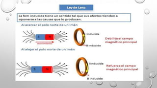 El documento resume los principales descubrimientos de Hans Christian Ørsted y Michael Faraday relacionados con la inducción electromagnética. Ørsted descubrió en 1820 que una corriente eléctrica puede afectar una aguja imantada, mientras que Faraday descubrió en 1840 que un campo magnético variable puede inducir una corriente eléctrica. Faraday formuló la ley de inducción electromagnética, la cual establece que una fuerza electromotriz se induce en un circuito cuando el flujo magnético a través del circuito cambia