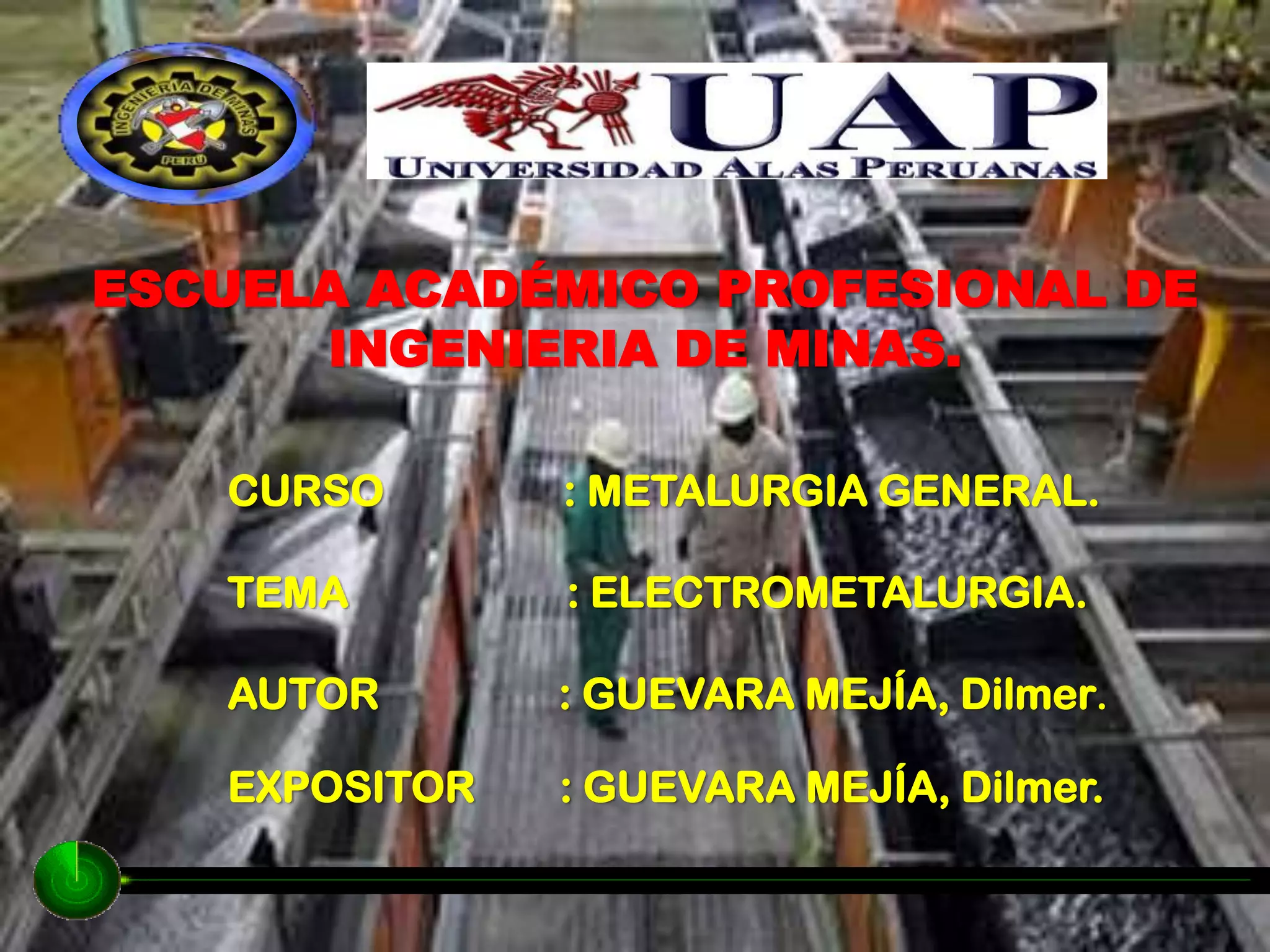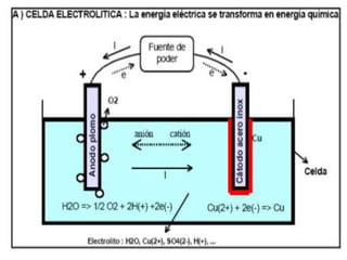 Este documento trata sobre la electrometalurgia. Explica que la electrometalurgia usa energía eléctrica para producir y procesar metales. Luego describe dos tipos principales: electrometalurgia en soluciones acuosas y en sales fundidas. Como ejemplos, explica los procesos de producción del cobre y aluminio, los cuales involucran etapas como trituración, tostado, fundición y electrolisis. El objetivo es conocer cómo la electrometalurgia afecta los metales y la extracción de minerales.