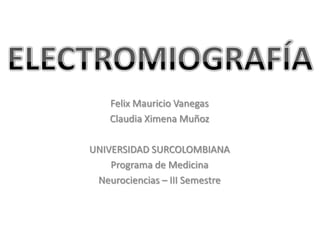 Este documento describe los fundamentos fisiológicos y el equipo instrumental de la electromiografía. Explica la estructura de la fibra muscular, la unión neuromuscular, los potenciales de acción y las contracciones musculares. Describe los potenciales característicos que se pueden medir, como la actividad de inserción y las fasciculaciones. Explica los patrones normales y anormales en un electromiograma y sus aplicaciones clínicas para evaluar condiciones miogénicas y neurógenas.