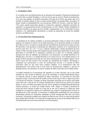 Este documento trata sobre la electromiografía, el estudio de la actividad eléctrica de los músculos del esqueleto. Explica los fundamentos fisiológicos, incluyendo la unidad motora y la generación de potenciales de acción. También describe el equipo instrumental utilizado, como electrodos, amplificadores y sistemas de registro. Finalmente, menciona algunos potenciales característicos que pueden registrarse mediante electromiografía.
