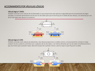 El documento describe diferentes tipos de válvulas lógicas y cómo estas pueden usarse para controlar accionamientos neumáticos de forma secuencial o condicional. Se explican válvulas AND, OR y selectores, y cómo estas pueden reemplazarse o emularse usando válvulas convencionales. También se detallan varios ejemplos prácticos de circuitos neumáticos que usan estas válvulas lógicas para lograr diferentes tipos de accionamientos.
