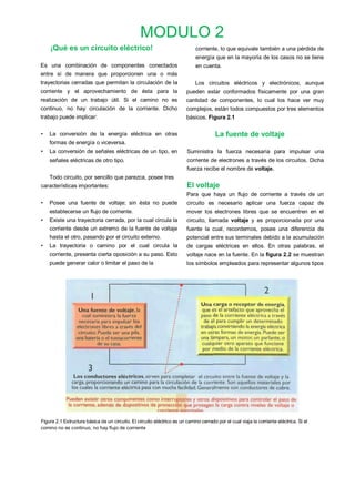 Este documento trata sobre circuitos eléctricos y electrónicos. Explica que un circuito eléctrico es una combinación de componentes conectados que permiten el flujo de corriente eléctrica. Todo circuito necesita una fuente de voltaje, un camino cerrado para la corriente, y elementos que ofrezcan resistencia a su paso. Los circuitos se componen de conductores, cargas, y una fuente de voltaje.