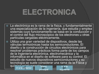 La electrónica estudia y emplea sistemas cuyo funcionamiento se basa en la conducción y el control del flujo de electrones. Se utiliza en áreas como el control, las telecomunicaciones y la electrónica de potencia. La ingeniería electrónica aplica estos conocimientos para resolver problemas prácticos mediante el diseño de circuitos electrónicos.