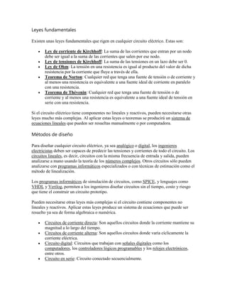 El documento describe los conceptos básicos de los circuitos eléctricos, incluyendo sus partes principales como componentes, nodos, ramales y mallas. Explica las leyes fundamentales que rigen los circuitos como las leyes de Kirchhoff y de Ohm, así como teoremas como los de Norton y Thévenin. También resume los diferentes tipos de circuitos como de corriente directa, alterna, digitales, y los métodos para su diseño e implementación.