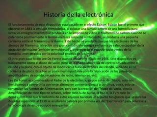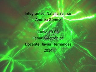 El documento presenta información sobre un proyecto de electrónica realizado por dos estudiantes, Natalia Salinas y Andrea Gómez, para el curso 10-03 en 2014 bajo la supervisión del docente Javier Hernández. Brevemente resume los orígenes de la electrónica y describe los componentes básicos de un sistema electrónico.