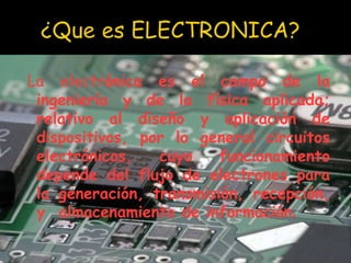 La electrónica estudia los dispositivos como tubos, diodos y transistores cuyo funcionamiento depende del flujo de electrones. Su historia comenzó en 1883 cuando Edison observó la emisión termoiónica en las bombillas. En 1883, Morse patentó el primer telégrafo que usaba circuitos eléctricos para transmitir señales de puntos y rayas a distancia. Actualmente, la electrónica desarrolla circuitos para comunicaciones y energía eléctrica y ha revolucionado campos como las comunicaciones e informática.