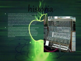 La música electrónica se produce utilizando instrumentos electrónicos como sintetizadores y samplers. Se ha vuelto más popular desde los años 1960 debido a la disponibilidad de tecnología musical a precios accesibles. Ahora incluye variedades como música experimental de concierto y música de baile popular.