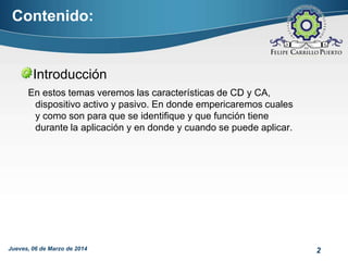 Este documento describe los diferentes tipos de componentes electrónicos, incluyendo capacitores, componentes activos y pasivos. Explica que los capacitores almacenan energía entre placas aisladas y cómo funcionan en circuitos de corriente continua y alterna. También define los componentes activos como aquellos que pueden controlar circuitos o proporcionar ganancia, e incluye ejemplos como amplificadores y transistores. Finalmente, describe los componentes pasivos lineales como condensadores, inductores y resistores, así como componentes electromecánicos y opt