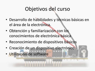 Este documento presenta los objetivos y materiales de un curso básico de electrónica. Los objetivos incluyen desarrollar habilidades básicas de electrónica, reconocer dispositivos básicos y crear un dispositivo electrónico. Los materiales incluyen una protoboard, pinzas, desarmadores y componentes electrónicos básicos. El documento también define conceptos como electricidad, corriente, voltaje y tipos de corriente, e introduce el uso de un multímetro para mediciones básicas.