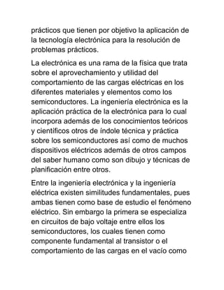 La ingeniería electrónica se encarga de resolver problemas de ingeniería relacionados con el control de procesos industriales y la transformación de la electricidad para el funcionamiento de diversos tipos de equipos. Se aplica en industrias, telecomunicaciones y el diseño de instrumentación electrónica. Se basa en el estudio teórico y práctico de circuitos de bajo voltaje y semiconductores.