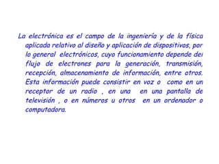 La electrónica estudia y emplea sistemas cuyo funcionamiento se basa en la conducción y el control del flujo de electrones. Incluye desde semiconductores hasta válvulas termoiónicas, y el diseño de circuitos electrónicos para resolver problemas prácticos. La electrónica es el campo de la ingeniería relativo al diseño y aplicación de dispositivos electrónicos cuyo funcionamiento depende del flujo de electrones para la generación, transmisión y recepción de información. Los circuitos electrónicos ofrecen diferentes funciones para proces