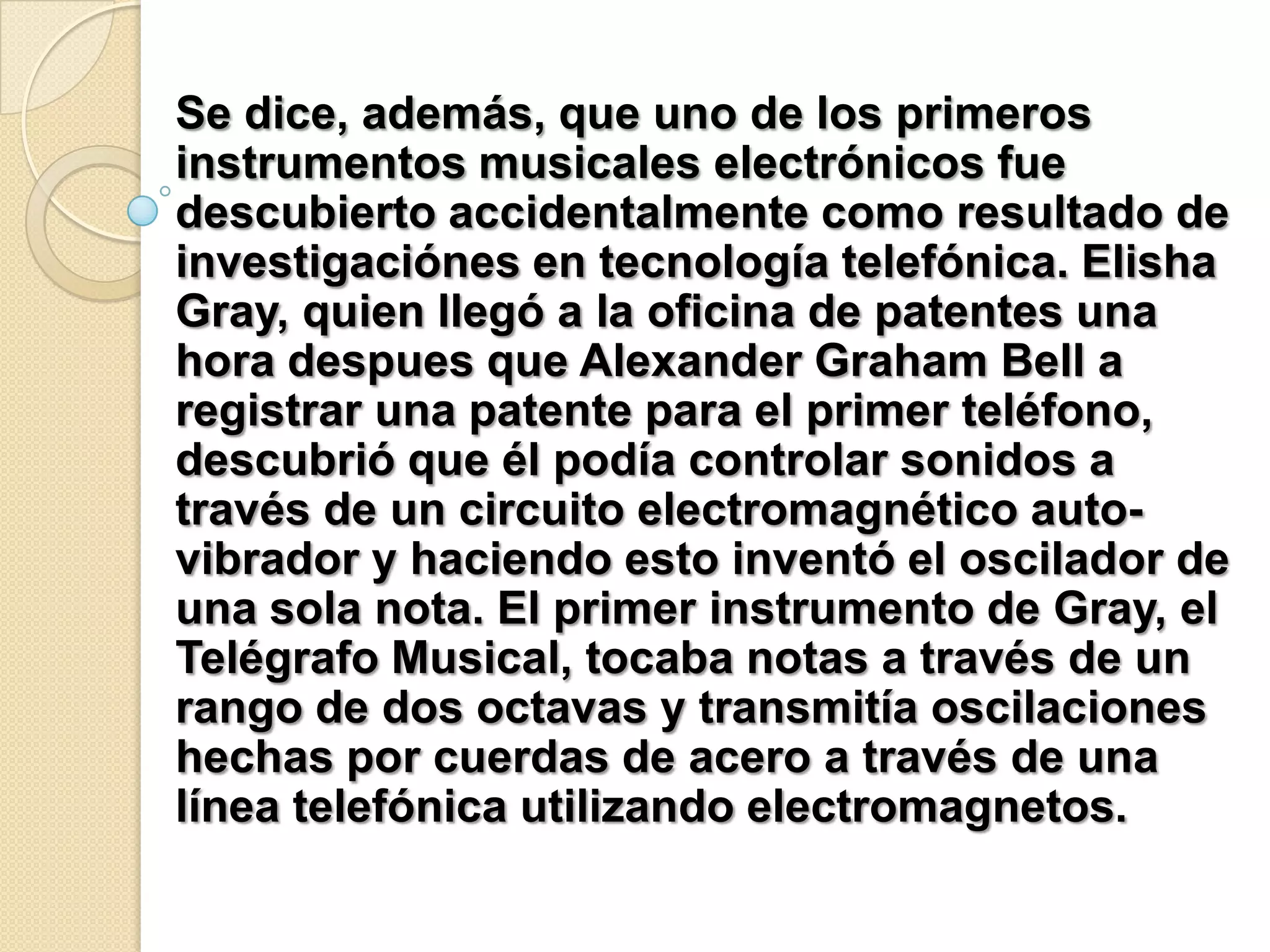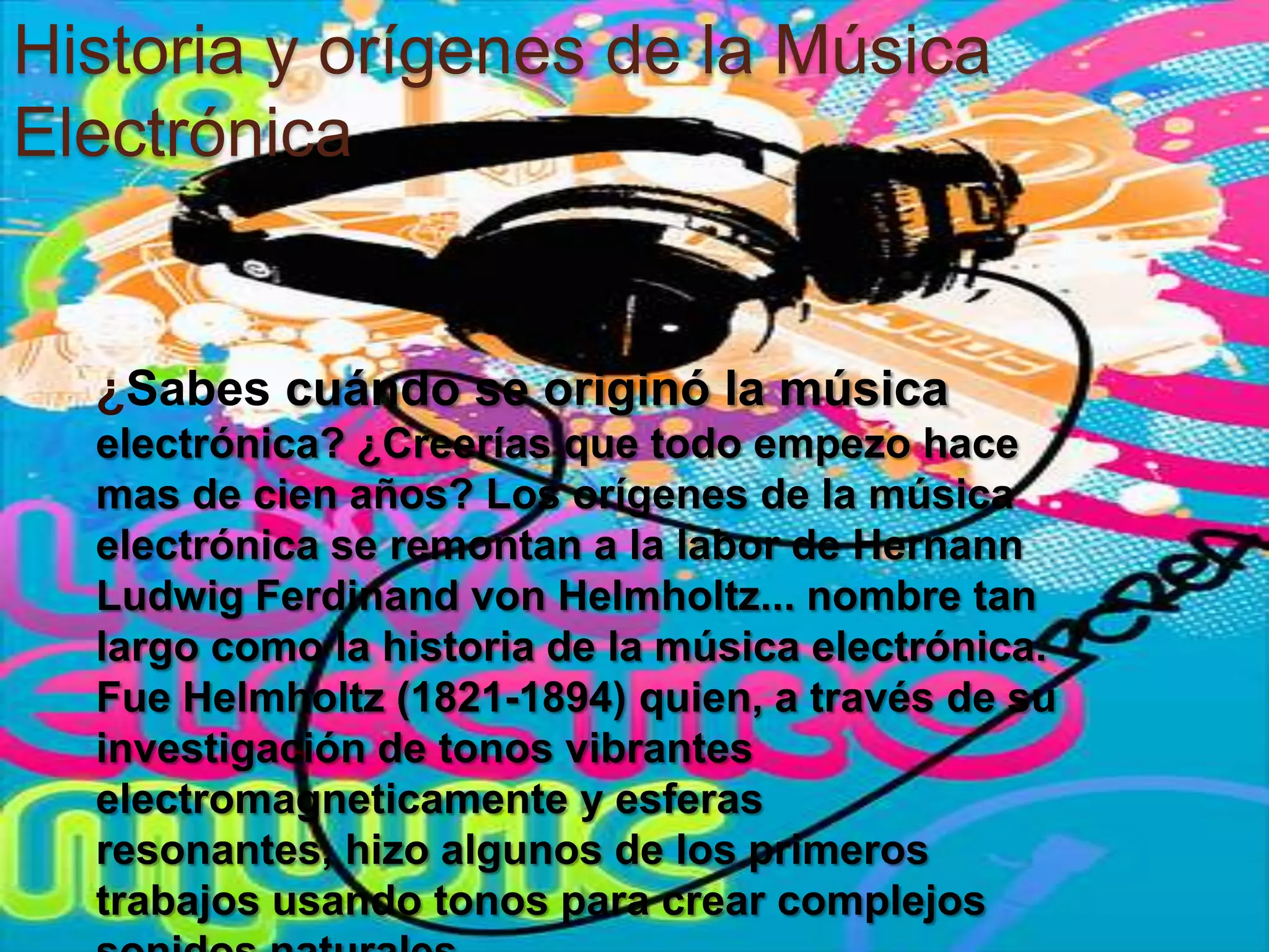 La música electrónica se originó hace más de 100 años a través del trabajo de Helmholtz, quien investigó tonos vibrantes electromagnéticamente y esferas resonantes para crear sonidos naturales. Más tarde, Elisha Gray descubrió que podía controlar sonidos a través de un circuito electromagnético auto-vibrador e inventó el oscilador de una sola nota. En las últimas décadas, los DJ se han convertido en una pieza clave del ámbito musical contemporáneo a través de sus mezclas musicales en discotec